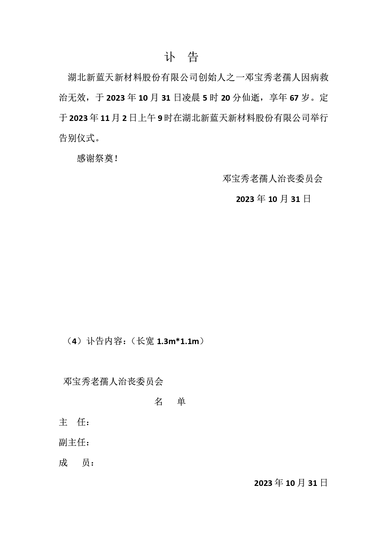 湖北新藍(lán)天新材料股份有限公司創(chuàng)始人之一鄧寶秀老孺人因病救治無(wú)效,于2023年10月31日凌晨5時(shí)20分仙逝,享年67歲。定于2023年11月2日上午9時(shí)在湖北新藍(lán)天新材料股份有限公司舉行告別儀式。...